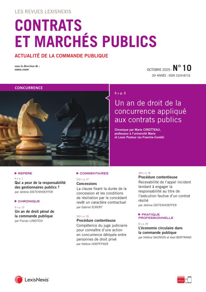 La présente chronique qui s’étend de juillet 2024 à juin 2025 porte sur les enjeux concurrentiels au sein des contrats publics. En matière d’attribution des contrats publics (1), si l’année a permis,...