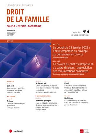 Les décisions les plus récentes dans ce domaine sont traitées à travers les rubriques suivantes : mariage, concubinage, pacte civil de solidarité, divorce, régimes matrimoniaux, successions-libéralités, adoption, filiation, autorité parentale, personnes protégées, en vous apportant l’éclairage du droit fiscal, du droit pénal et du droit international privé.