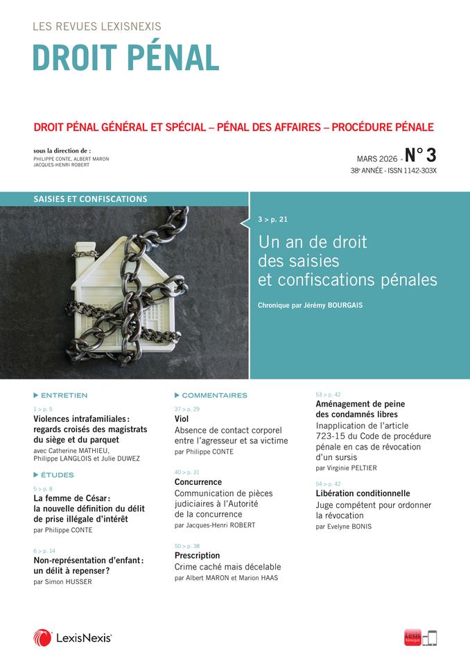 La revue “Droit Pénal” se fait chaque mois l’écho de l’actualité en droit pénal en sélectionnant les informations essentielles, les décisions les plus pertinentes, livrées en larges extraits et commentées par des pénalistes de renom.