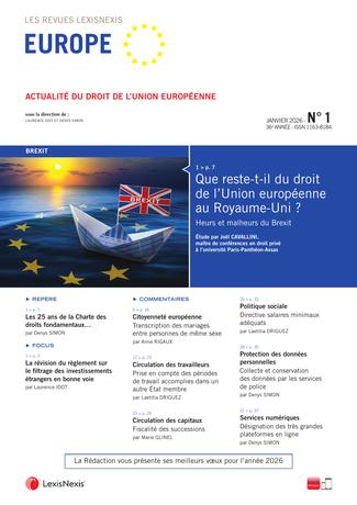 Le mensuel du droit de l’Union européenne L’actualité du droit de l’Union européenne est suivie au plus près à travers des études, analyses des principaux textes adoptés par les institutions de l’Union européenne, de la jurisprudence de la Cour de justice et du Tribunal, et de leurs répercussions au niveau national. Direction scientifique : Laurence Idot et Denys Simon