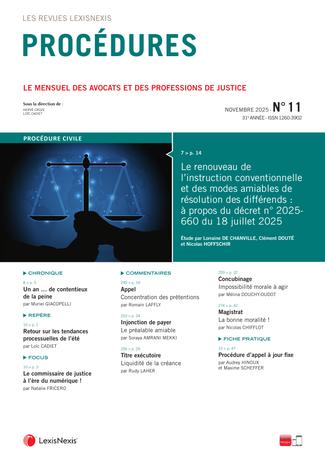 procédures spécifiques (contentieux du travail, arbitrage, contentieux de la famille …), des procédures européennes ainsi que des procédures pénale, administrative et fiscale. Après un article de synthèse, chaque numéro offre une sélection pertinente de l’actualité des textes et de la jurisprudence, traitées sous forme d’extraits commentés qui sont parfois assortis de conseils pratiques ou d’argumentaires.